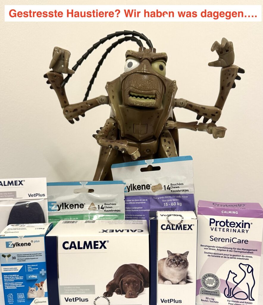 Wir führen bewährte Futtermittelzusätze zur Stressreduktion bei Hunden und Katzen: Protexin Serenicare; Calmex Hund; Calmex Katze; Zylkène Chews; Zylkène Kapseln.